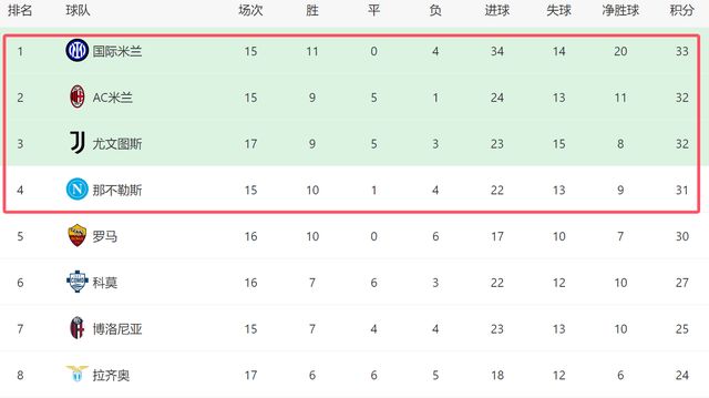 截至目前,尤文排名已经反超那不勒斯,升上第三位,而且他们只落后榜首的国米1分。不过虽然尤文成功进入争冠的行列,但是他们依然不能大意,因为如今国米、AC米兰和那不勒斯都少赛2场(之前参加意超杯第16轮联赛延期和本轮比赛还没踢),因此尤文和对手的差距,还有可能被拉大。